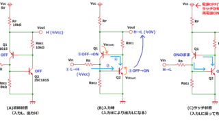 NPNとPNPトランジスタを組合せることで一度入力信号がONになったらOFFになっても出力状態を維持し続けるラッチ回路について解説します。