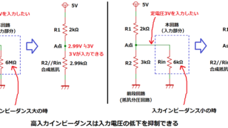 インピーダンスの考え方と入力&出力インピーダンスが高いor低い場合に回路にどのような影響を与えるかを解説し、その悪影響を無くすボルテージフォロワを使った回路例を紹介します。